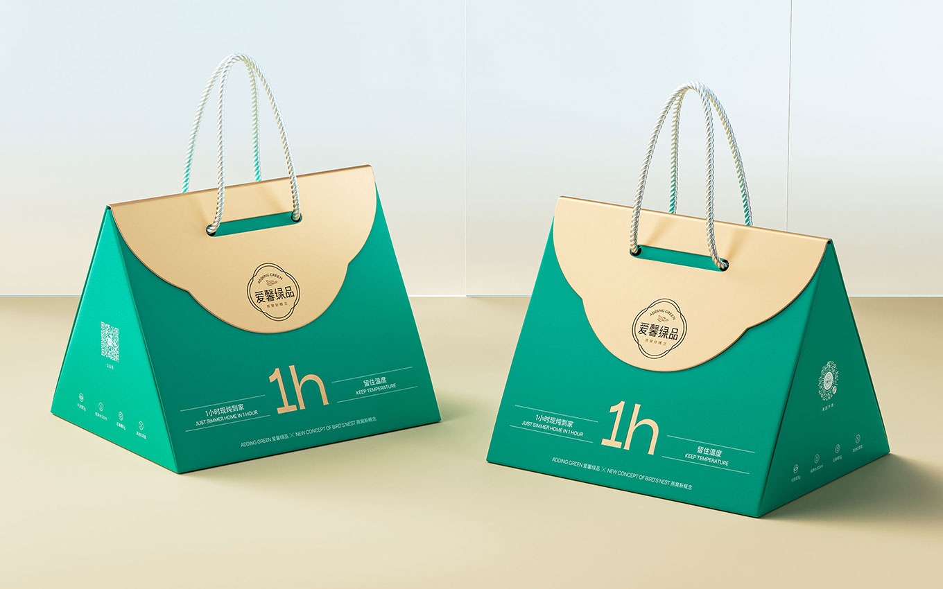 我們的設(shè)計團隊以提升產(chǎn)品在消費場景中的顏值為基礎(chǔ),并在不增加包材成本的前提下,致力于讓包裝設(shè)計更具吸引力。最終,我們以大眾熟知的"手袋"樣式作為創(chuàng)意原點,為愛馨綠品現(xiàn)燉燕窩創(chuàng)造了全新的包裝設(shè)計。這種設(shè)計不僅使消費者能夠方便地拿到新鮮快速的外賣產(chǎn)品,還給予了禮品式的體驗,為品牌帶來了強烈的美譽度。
